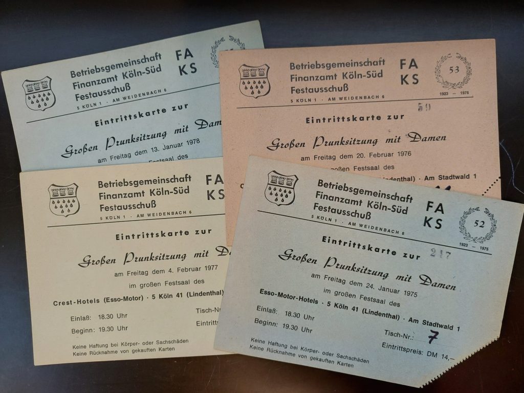 1953 war ein ereignisreiches Jahr für die Angehörigen des Finanzamtes Köln-Süd, denn im Sommer dieses Jahres wurde das neue Dienstgebäude Am Weidenbach 6 bezogen. Die Prunksitzung fand in diesem Jahr im Gertrudenhof statt. 1954 übernahm Herr Ewald Göddertz -Betriebsprüfer beim Finanzamt Köln-Süd sowie Mitbegründer und Präsident der Karnevalsgesellschaft Alt-Lindenthal – das Amt des Literaten.